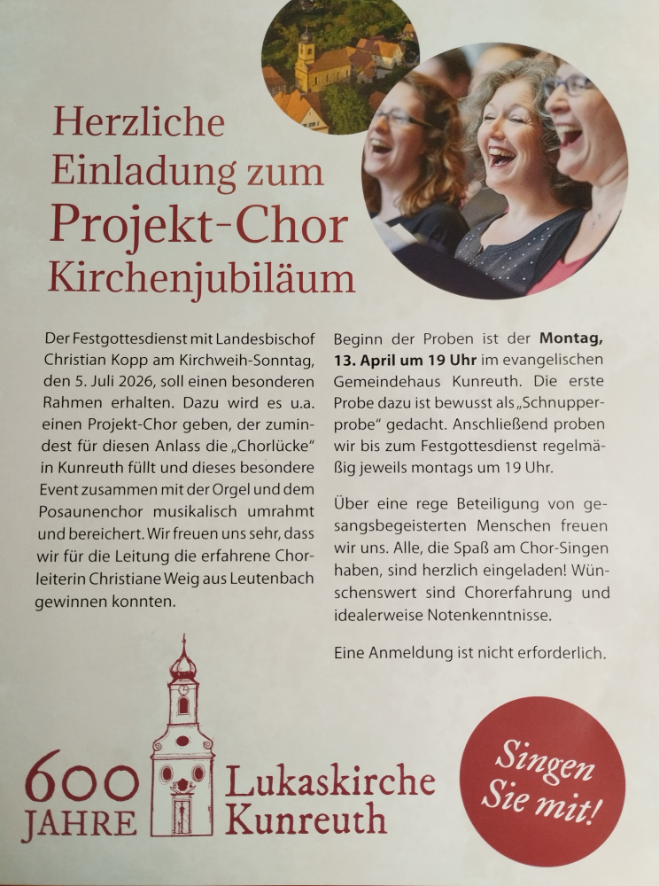 Im Jahr 2026 begeht unsere evangelische Kirchengemeinde Kunreuth ihr 600 jähriges Weihejubiläum. Für das Jubiläumsjahr ist ein attraktives Programm geplant, das Sie hier einsehen können ( Download Flyer siehe unten):