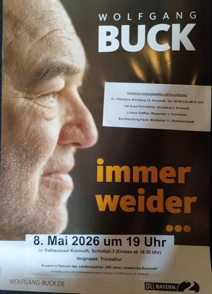 Im Jahr 2026 begeht unsere evangelische Kirchengemeinde Kunreuth ihr 600 jähriges Weihejubiläum. Für das Jubiläumsjahr ist ein attraktives Programm geplant, das Sie hier einsehen können ( Download Flyer siehe unten):